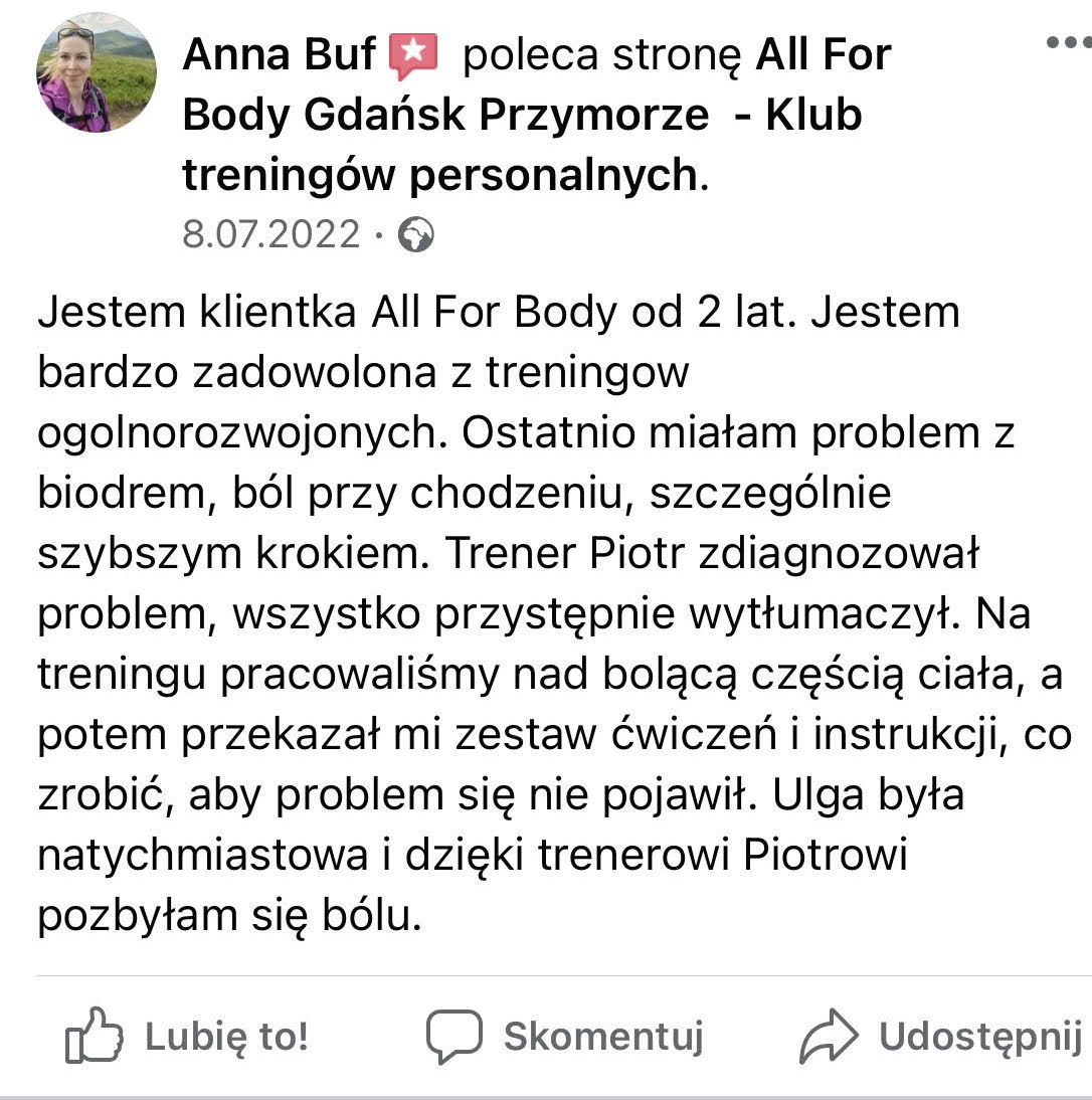 Ostatnio miałam problem z biodrem, ból przy chodzeniu, szczególnie szybszym krokiem. Trener Piotr zdiagnozował problem, wszystko przystępnie wytłumaczył.